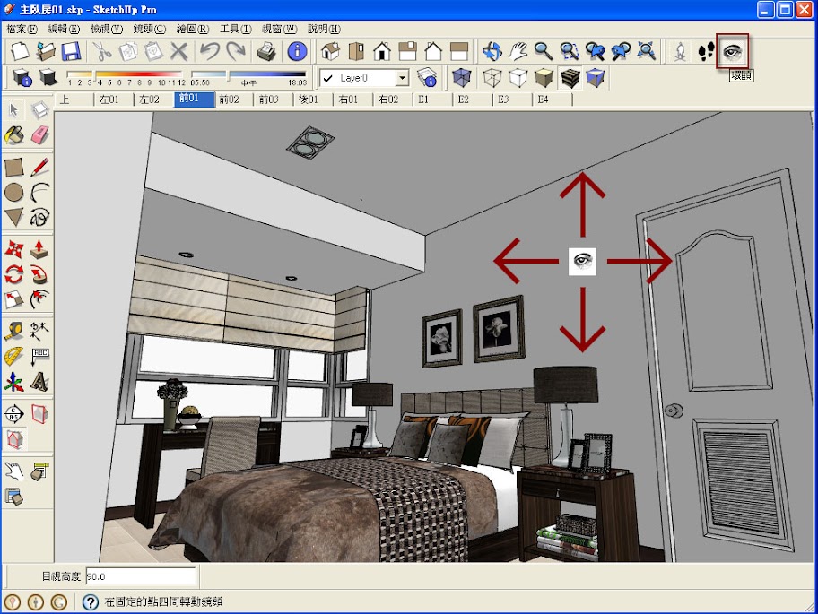 以上圖來說,希望視角能往後退一點 , 又不希望更改視角高度 , 就可以使用[行走] 工具